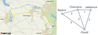 Z tohoto grafu bychom například zjistili, že nejkratší cesta z Rejšic do Jabkenic má 3 kilometry a vede přes Charvatce.