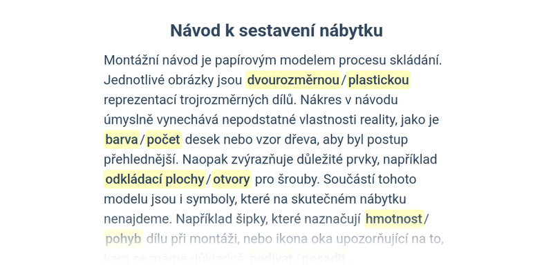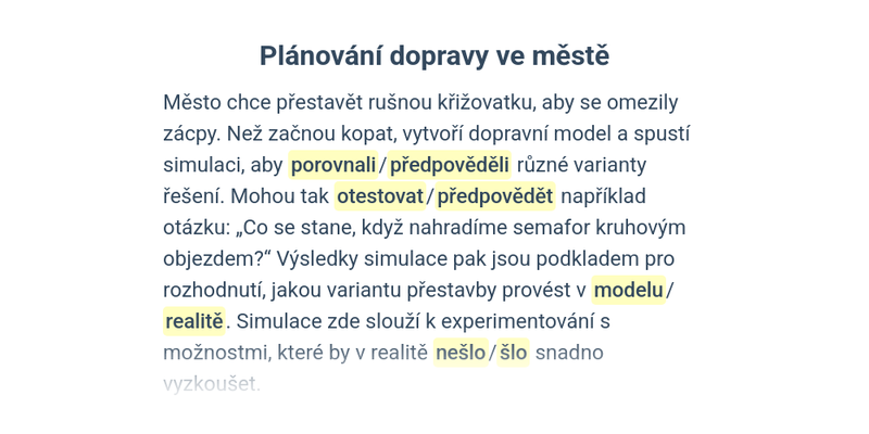 Krátké texty, do kterých doplňujete na vybraná místa správnou variantu ze dvou možností.
